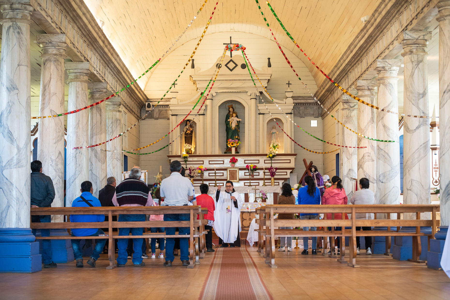En su interior, se destaca de entre otras iglesias del archipiélago por su predominante pintura blanca, que la dota de una luminosidad y pulcritud notable. Al igual que en las iglesias de Nercón y Detif, la pintura de sus columnas interiores imita el mármol.