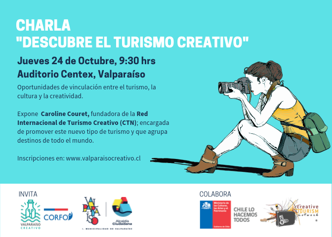 Entre las actividades organizadas por el programa de Corfo Valparaíso Creativo y la Dirección de Turismo de la Municipalidad de Valparaíso está la charla «Descubre el Turismo Creativo: Oportunidades de vinculación entre el turismo, la cultura y la creatividad» que se realizará el próximo jueves 24 de octubre a las 9.30 horas en el Zócalo del Centex del Ministerio de las Culturas, las Artes y el Patrimonio ubicado en Sotomayor 233. La charla está dirigida a todas aquellas personas que tengan un interés en el desarrollo del turismo creativo o quieran conocer un poco más del tema. Se busca mediante ésta dar conocer las implicancias que trae el turismo creativo para la comunidad local y las oportunidades que pueden surgir a partir de éste.