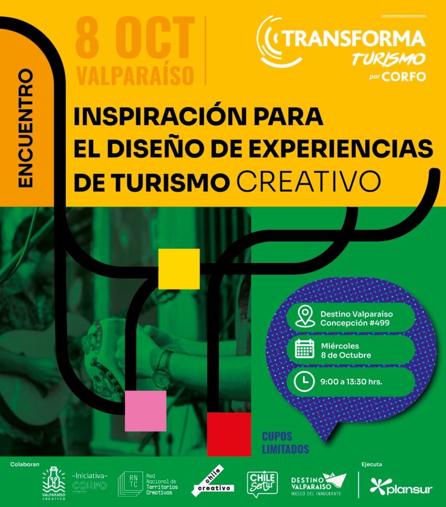 El miércoles 8 de octubre, a las 09:00 hrs., se llevará a cabo el encuentro “Inspiración para el diseño de experiencias de turismo creativo”, organizado por Transforma Turismo y apoyado por el Comité Gestor Nacional de Turismo Creativo, en colaboración con Valparaíso Creativo.