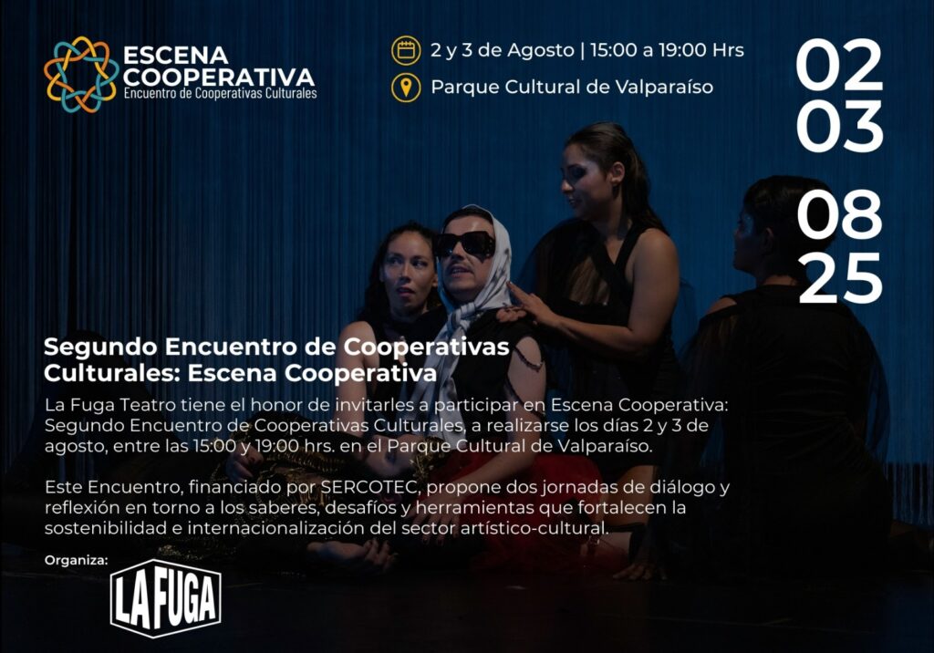 El 2 y 3 de agosto, entre las 15:00 y 19:00 horas, el Parque Cultural de Valparaíso acogerá el Segundo Encuentro de Cooperativas Culturales: Escena Cooperativa, organizado por La Fuga Teatro y financiado por SERCOTEC. Dos jornadas de intercambio, reflexión y acción colectiva para fortalecer el cooperativismo cultural en Chile.