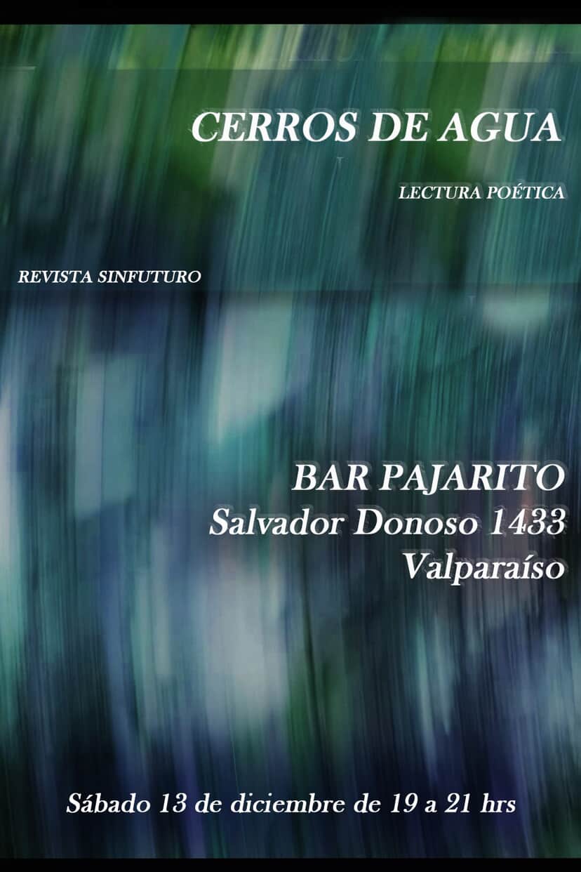 Este sábado 13 de diciembre, a las 19:00 horas, se realizará la lectura poética “Cerros de Agua” en Bar Pajarito (Salvador Donoso 1433).