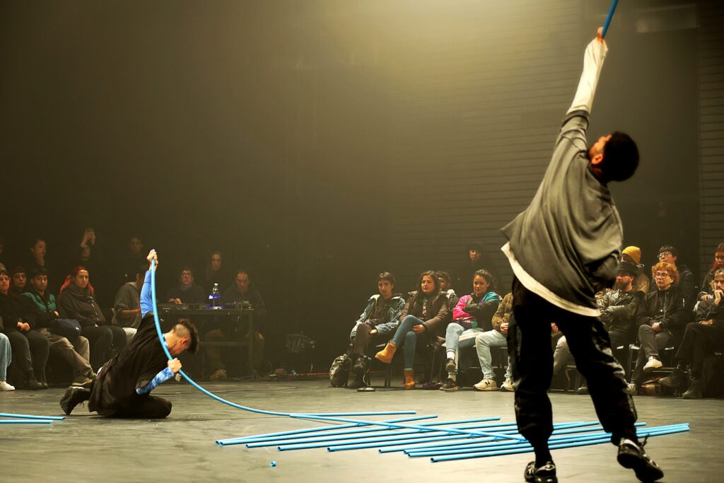 La experiencia incluye materialidades que resaltan: tubos, placas metálicas y un paisaje sonoro que se construye en la interacción con los cuerpos. Los elementos no actúan como escenografía ni como objetos externos, sino como agentes activos en una coreografía expandida. “El dispositivo es abierto, indeterminado y proliferante. Su fuerza radica en esa fluctuación constante entre formas, roles y presencias”, agregan.