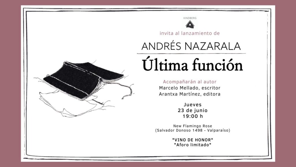 La presentación de Última función se realizará el próximo jueves 23 de junio a las 19:00 horas en el nuevo Flamingo Rose de Valparaíso (Salvador Donoso 1498). Junto a Andrés Nazarala estarán el escritor Marcelo Mellado y la editora de Kindberg, Arantxa Martínez. En la actividad se proyectarán pasajes de algunas de las películas que se citan en el libro y habrá un vino de honor. La entrada es gratuita.