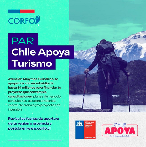 Corfo sigue impulsando a las Mipymes del sector turístico para que puedan entregar más experiencias inolvidables a los visitantes de nuestro territorio. El PAR #ChileApoya Turismo busca entregar herramientas a micro, pequeñas y medianas empresas del sector turístico. Esto para la recuperación de su potencial productivo y de gestión, mediante el financiamiento de proyectos individuales que contemplen capacitación, planes de negocio, consultorías, asistencia técnica, capital de trabajo y/o proyectos de inversión.